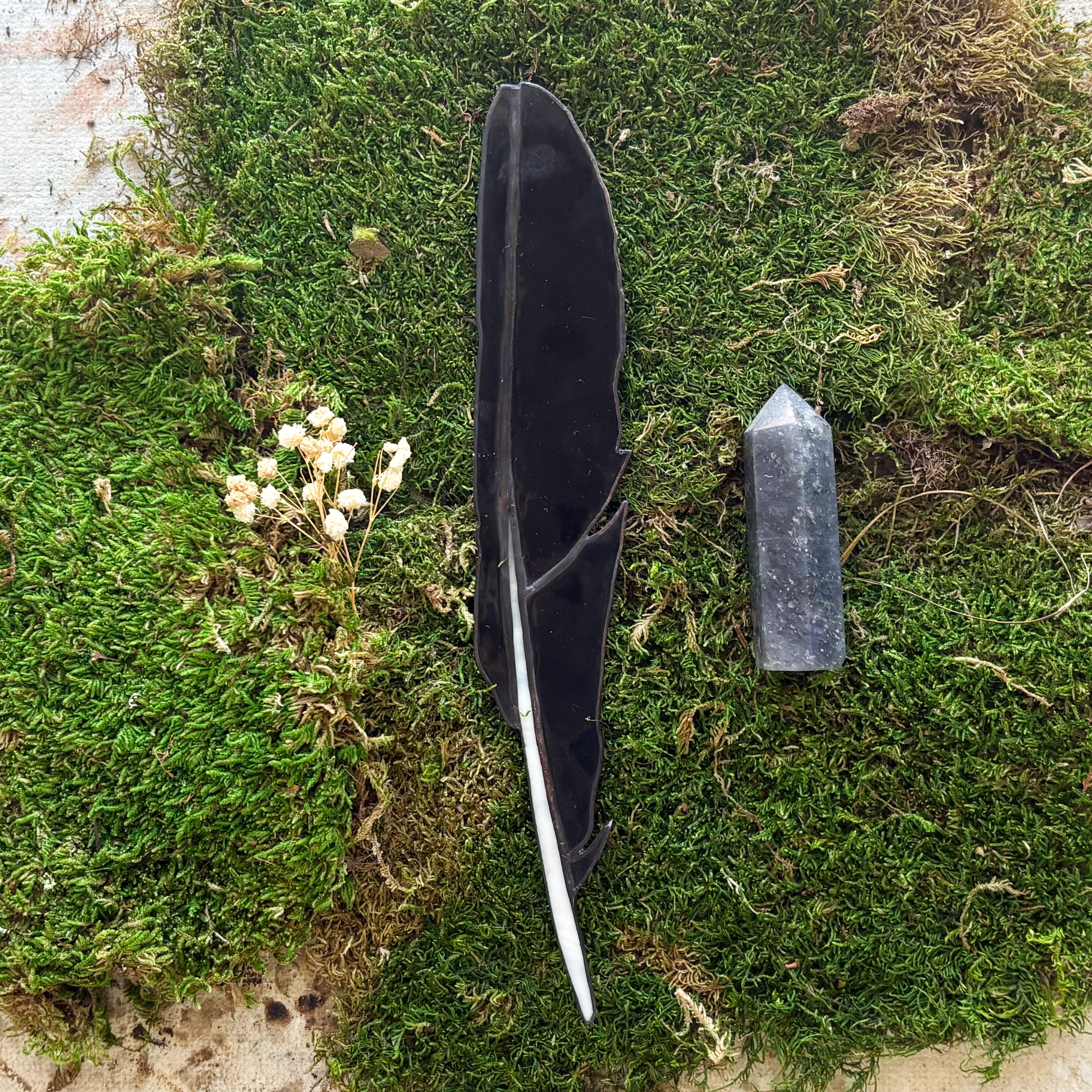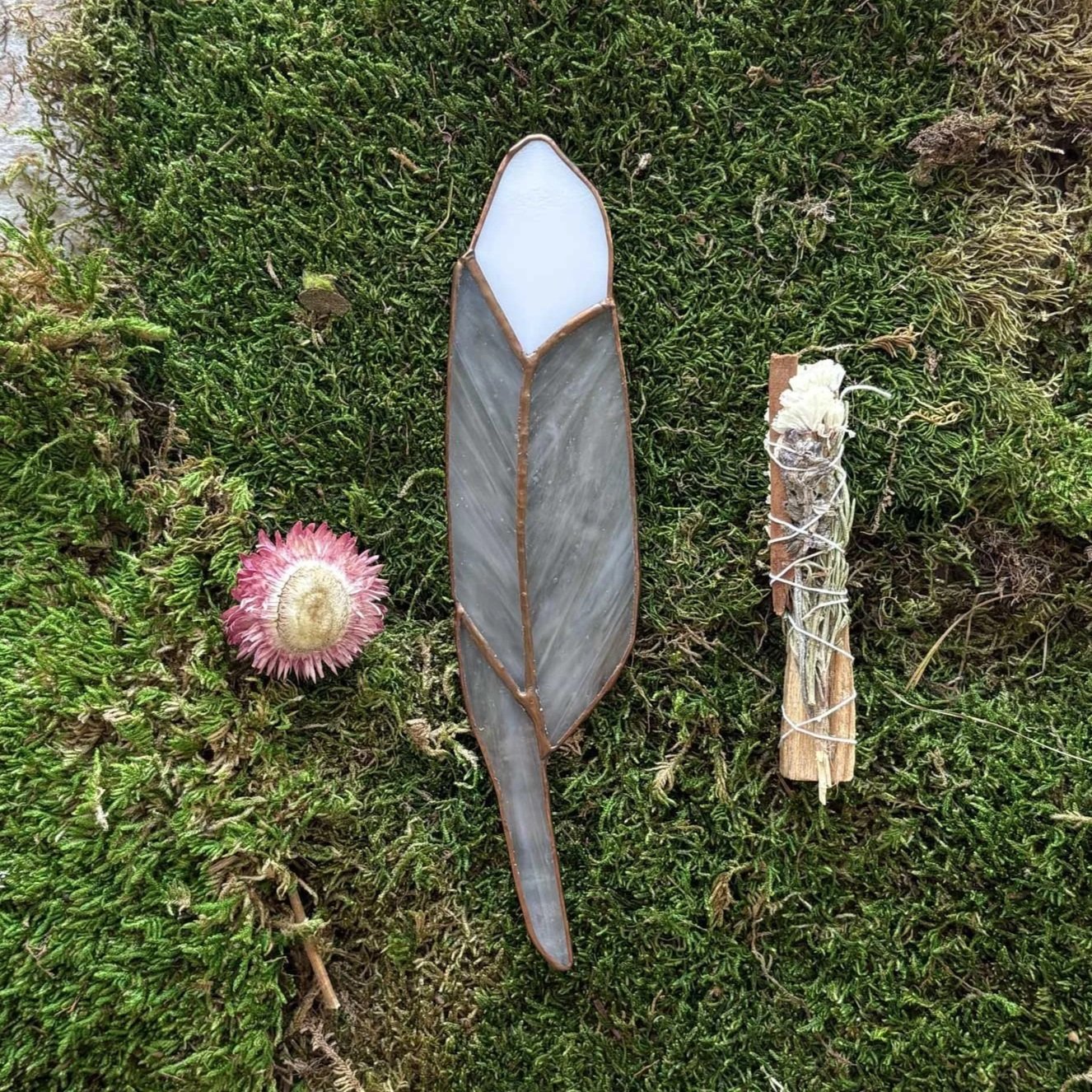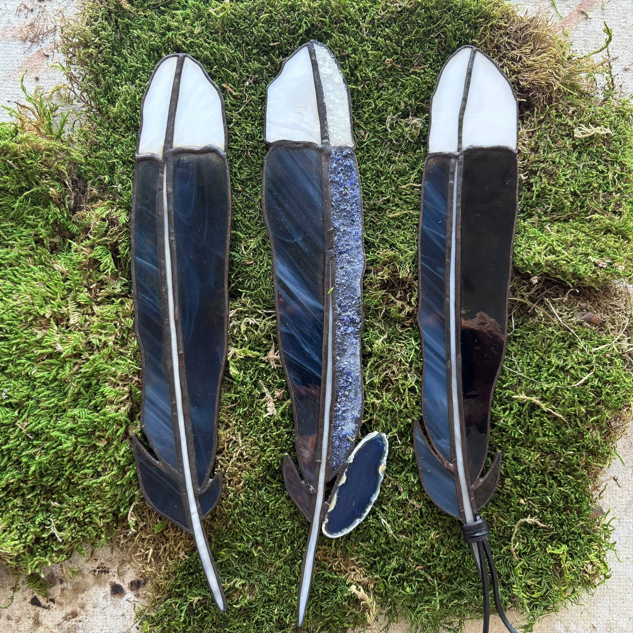 From blueprint to heirloom, each piece is reimagined to amplify the totem’s energetic resonance. Blue jay feathers pair glass with agate, aquamarine and sodalite dust; cardinal feathers cradle peach selenite.