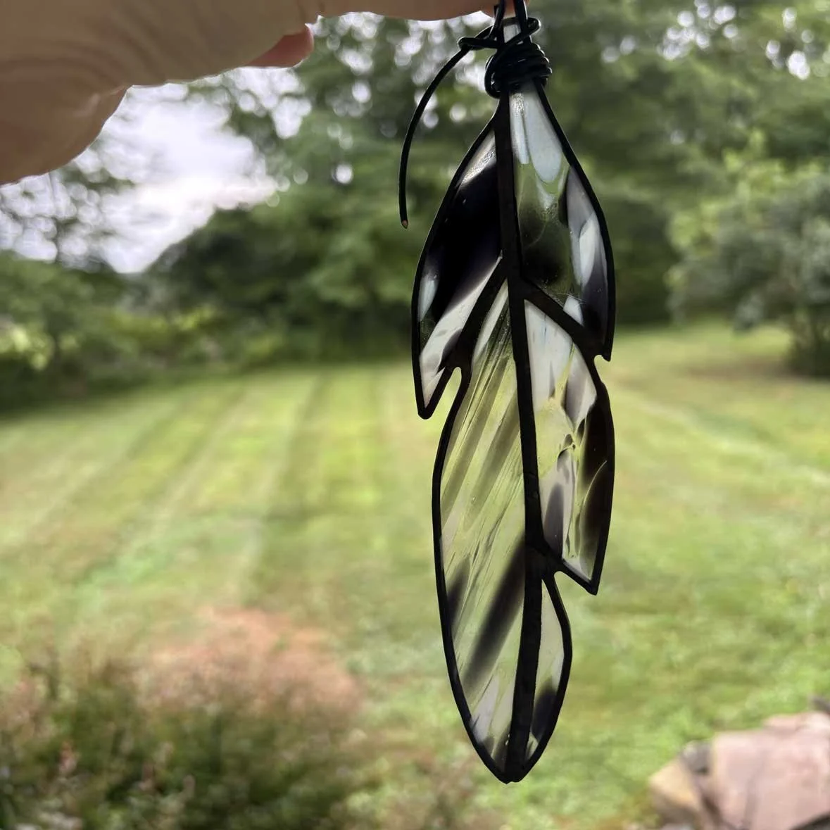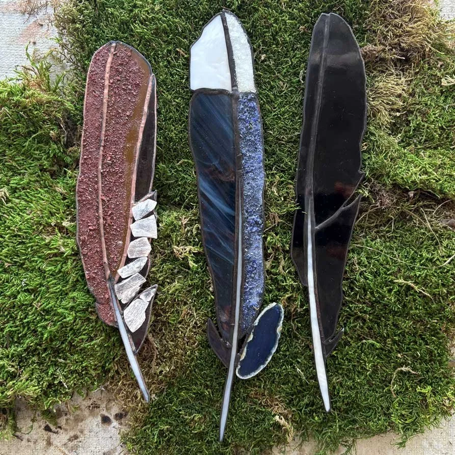 Spiritual ritual and embodied stillness initiate my process—an impression or image arises in meditation and intuitive movement that I follow through experimentation. Research of American stained glass history—especially the overlooked legacy of Clara Driscoll and the Tiffany Girls—anchors my work in tradition alongside intentional modernism. My background in jewelry informs bridging mediums: I adapt Tiffany techniques into intimate “jewelry for the space,” incorporating gem dust, minerals, and stones alongside traditional sheet glass to intensify narrative and material significance. My works query grief, love, and spiritual presence, inquiring, “What is unexpressed? What is ready to be seen? Felt?”